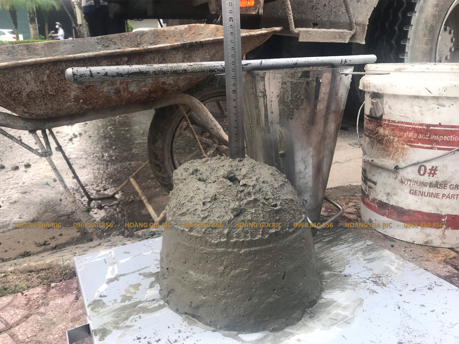 Bê tông được kiểm tra độ sụt và lấy mẫu thí nghiệm trước khi đổ.