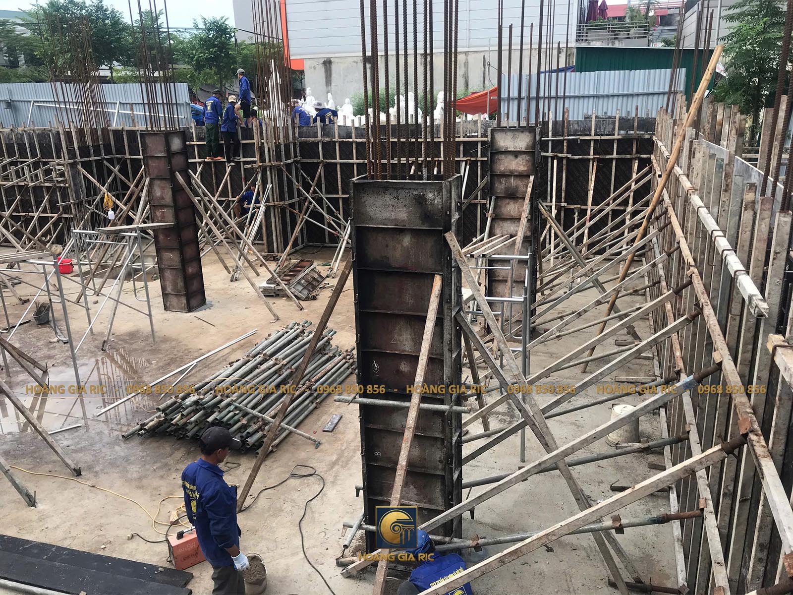Cốp pha: Sử dụng hệ cốp pha phủ phim kết hợp hệ gông, ty ren và thanh chống gia cố chắc chắn. Mục đích là để đảm bảo vách tường khi đổ bê tông không bị phình, kích thước hình học chính xác và bề mặt bê tông sau khi tháo khuôn đạt độ phẳng, mịn.