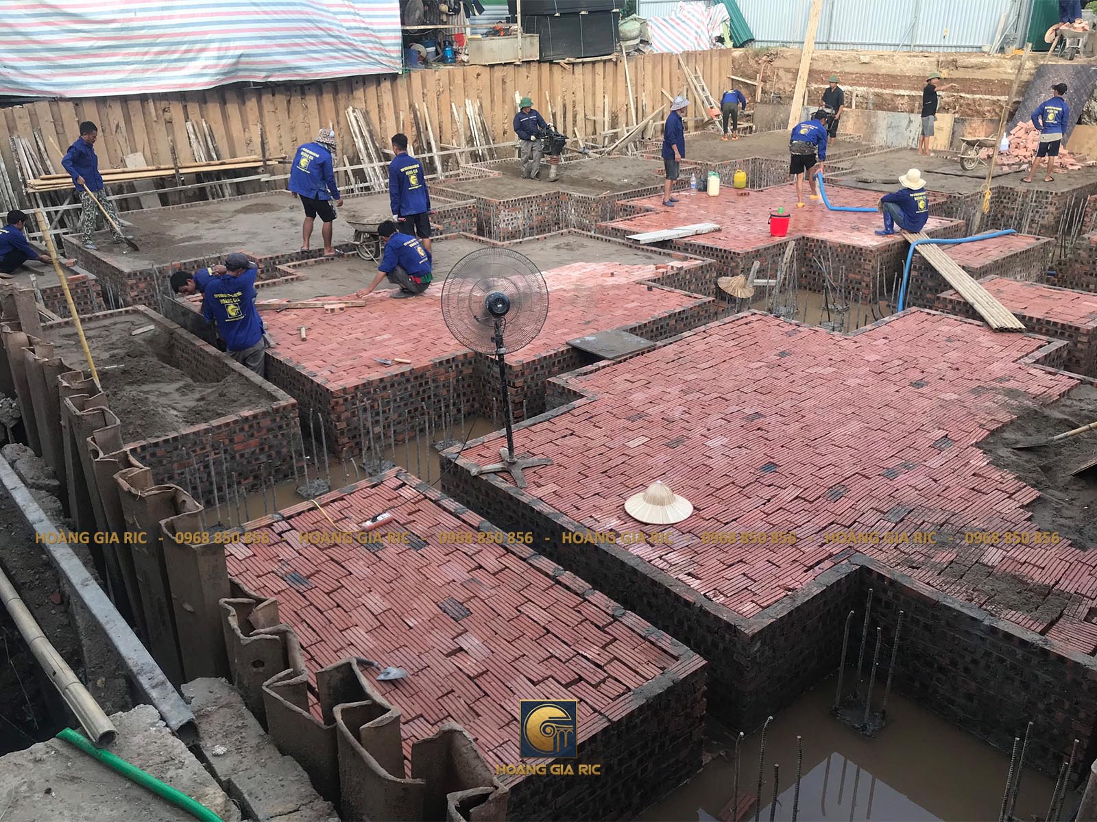 Định hình đài cọc bằng tường gạch: Đây là một tiêu chuẩn khác biệt của Hoàng Gia RIC. Thay vì ván gỗ, chúng tôi xây tường gạch kiên cố để làm cốp pha. Điều này cam kết kích thước đài cọc chính xác tuyệt đối, không bị biến dạng khi đổ bê tông.